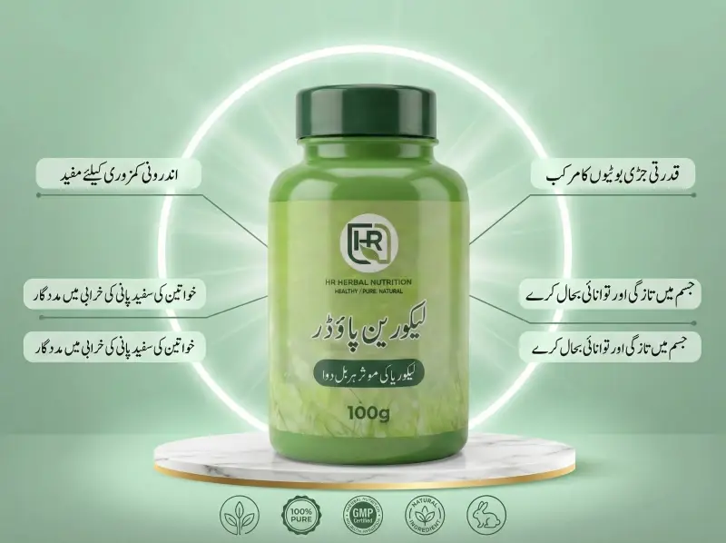 لیکورین پاؤڈر ایچ آر ہربل نیوٹریشن کی جانب سے تیار کردہ ایک خالص ہربل نسخہ ہے جو خصوصی طور پر خواتین کی صحت کو مدنظر رکھتے ہوئے بنایا گیا ہے۔ یہ پراڈکٹ خاص طور پر سفید پانی (لیکوریا) کی شکایت میں مدد فراہم کرتی ہے اور جسم کی اندرونی کمزوری، تھکن اور نقاہت کو کم کرنے میں معاون ثابت ہوتی ہے۔